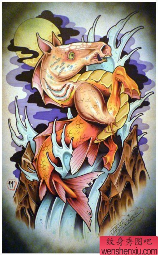 一张很酷经典的马头鱼尾兽纹身图案