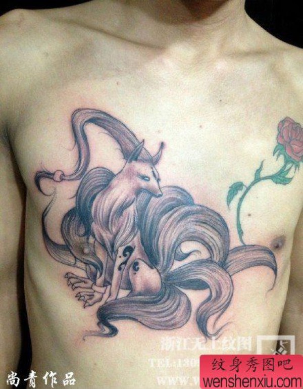男生前胸经典帅气的九尾狐纹身图案