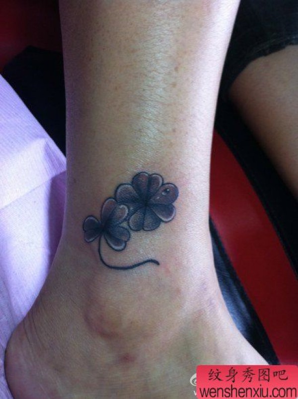 女生脚踝处小巧的一张黑白四叶草纹身图案
