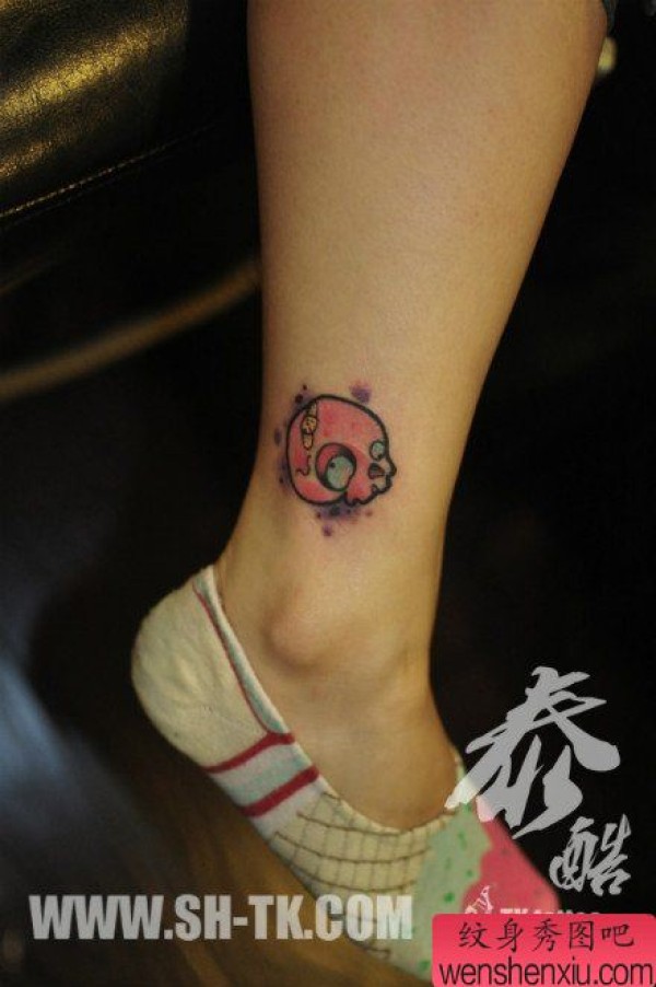 女孩子腿部一张小巧可爱的骷髅纹身图案