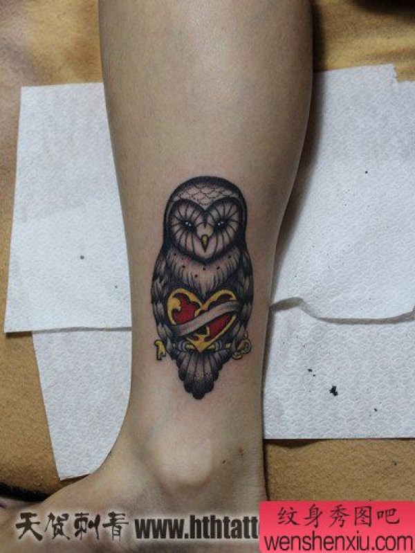 腿部一张简单时尚的猫头鹰纹身图案