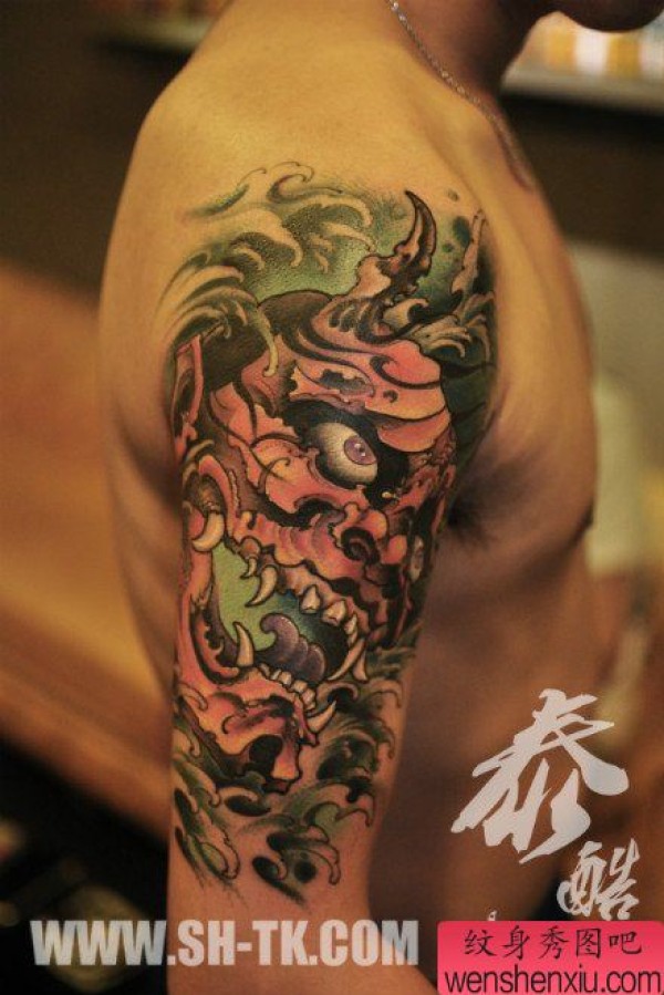 手臂时尚很酷的一张彩色般若纹身图案