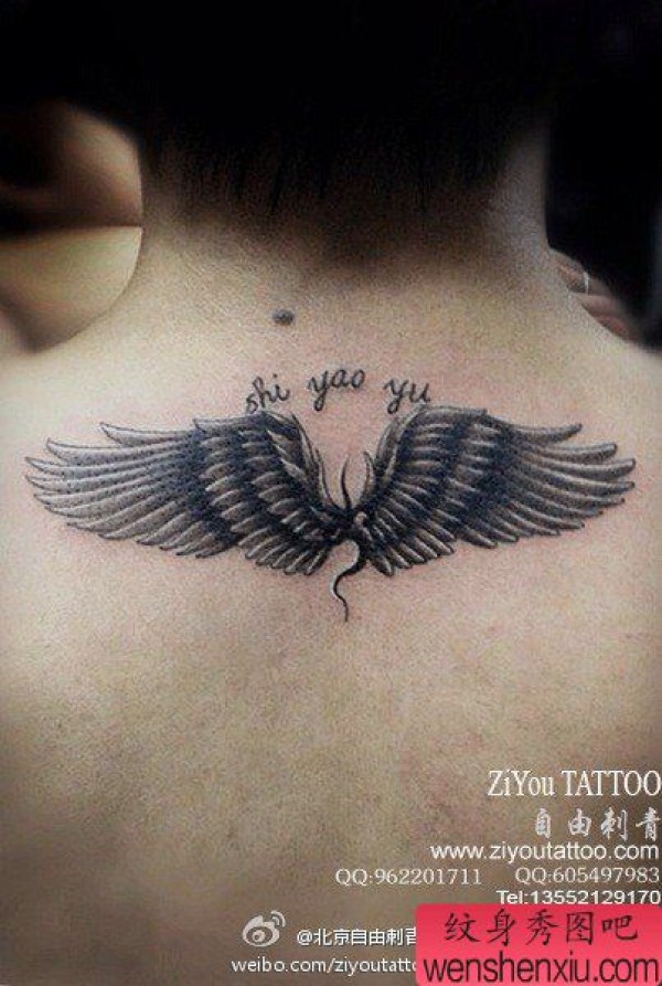 后背唯美写实的一张翅膀纹身图案