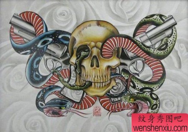 时尚很帅的一张骷髅蛇手枪纹身图案