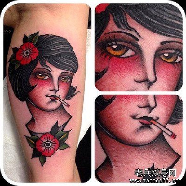 小腿上的一张欧美人物纹身图案