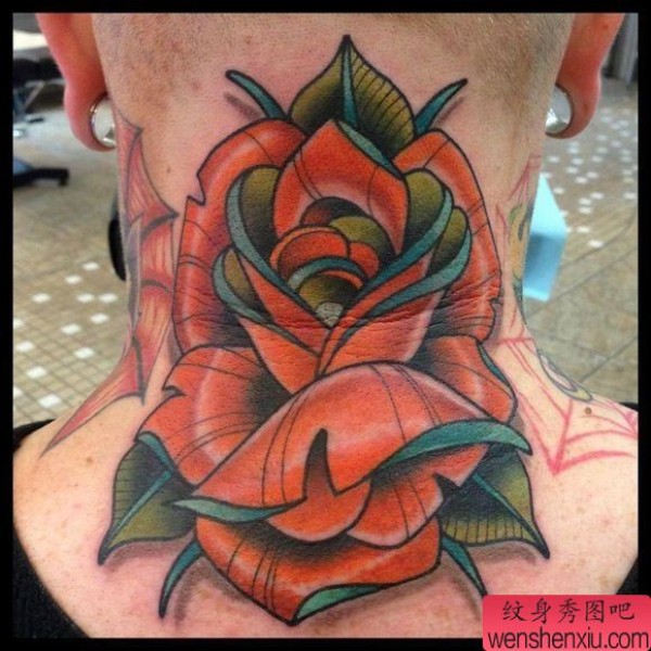 脖子上一张欧美玫瑰花纹身图片欣赏