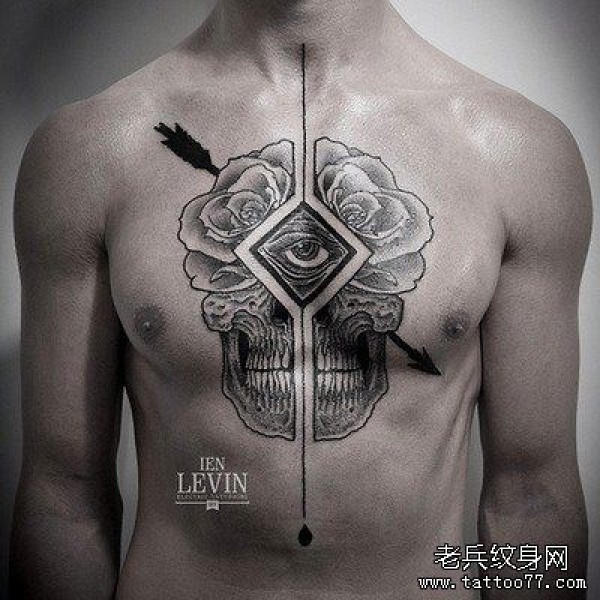一张男子胸口一张线条骷髅纹身图案