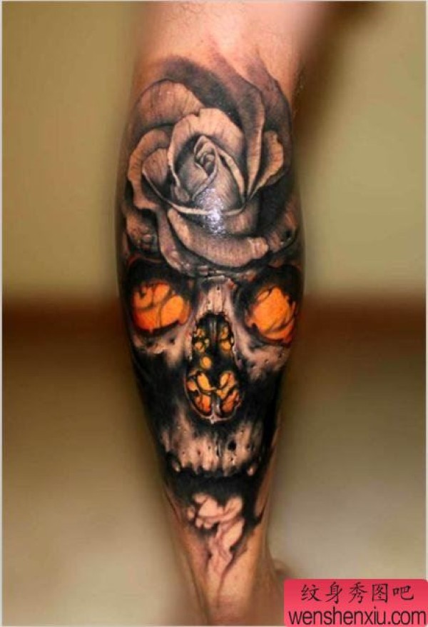 小腿上一张精细的骷髅玫瑰花纹身作品