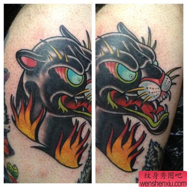 大臂上一张霸气的欧美黑豹纹身图案