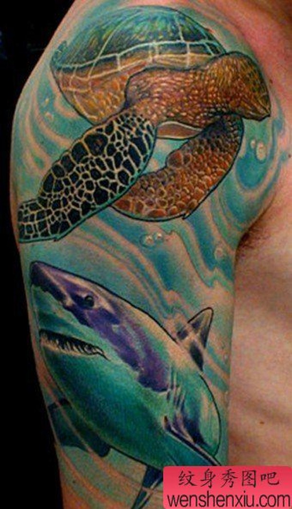 一张欧美海洋世界花臂纹身图片
