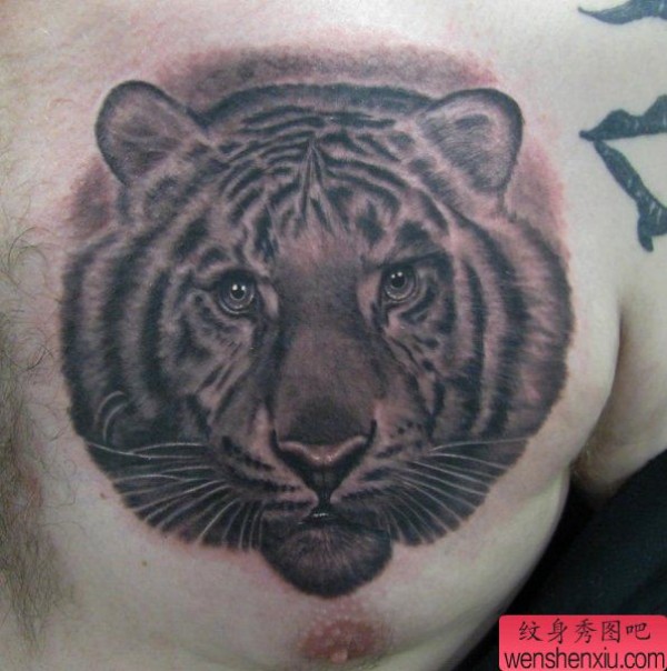 胸口上一张霸气的虎头纹身图案