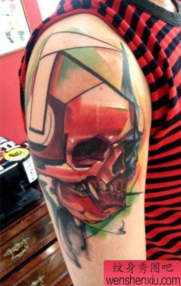 大臂上一张抽象彩色骷髅纹身作品欣赏
