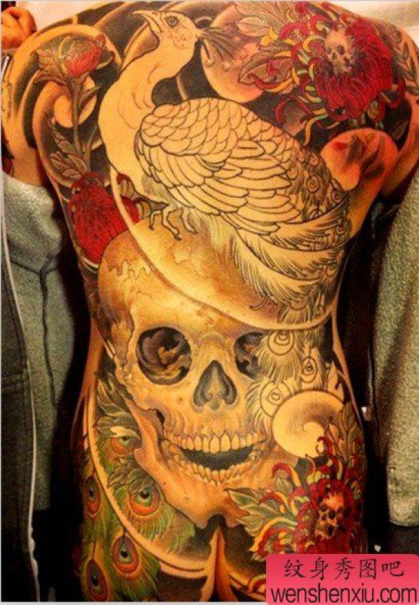 一张传统经典满背孔雀骷髅纹身作品欣赏