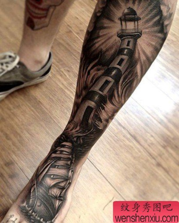 分享一张经典的灯塔花腿纹身图片