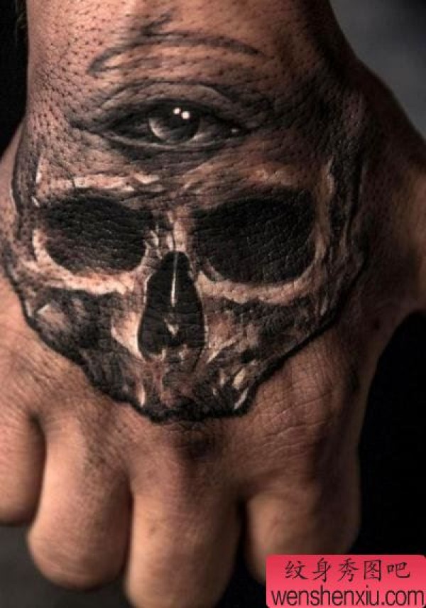 手背上一张个性骷髅纹身图案