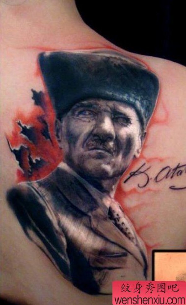 后背上的一张欧美人物肖像纹身作品