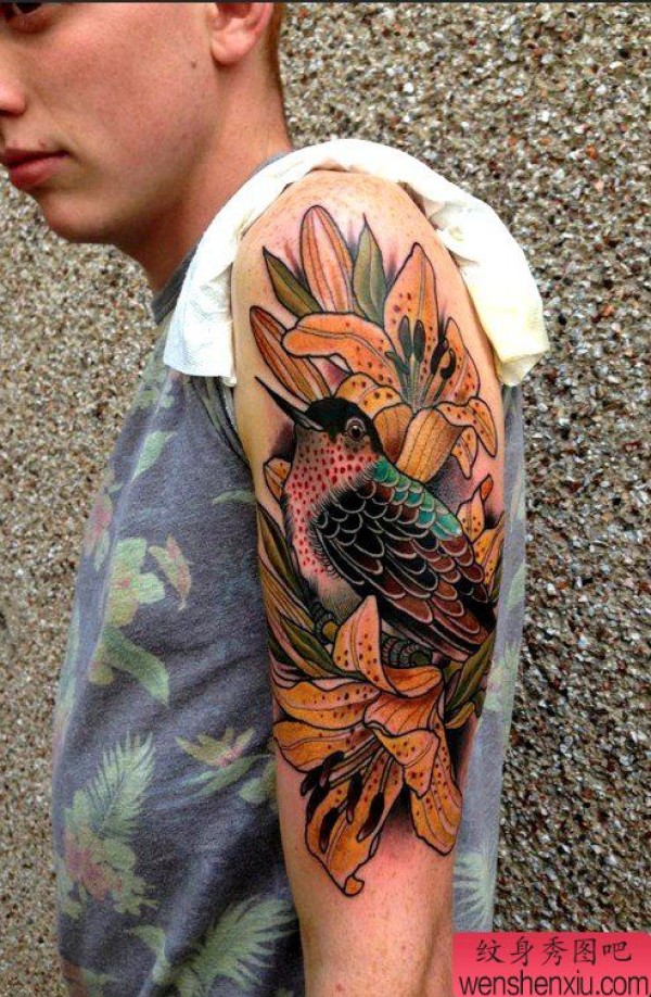 帅哥大臂上一张漂亮的百合花鸟纹身图片