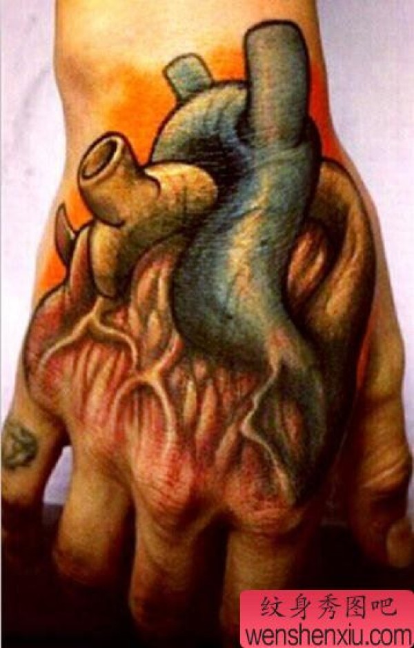 手背上一张恐怖心脏纹身作品