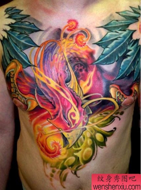 胸口一张彩色凤凰纹身图案