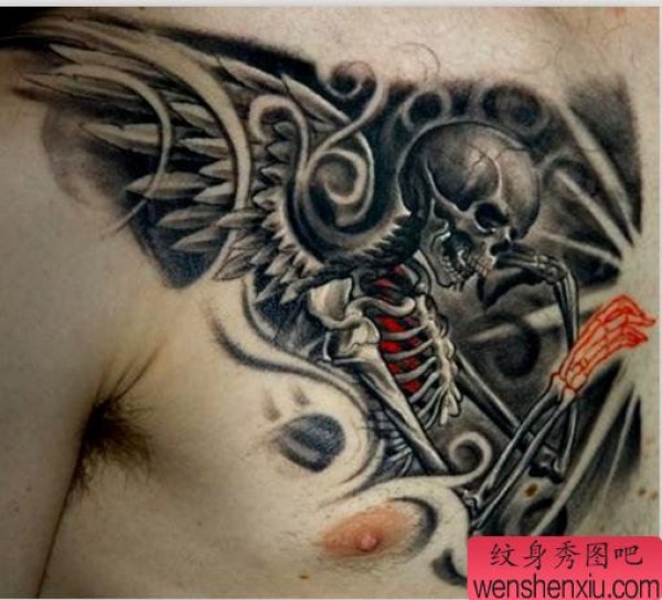 胸口上一张霸气的骷髅翅膀纹身作品