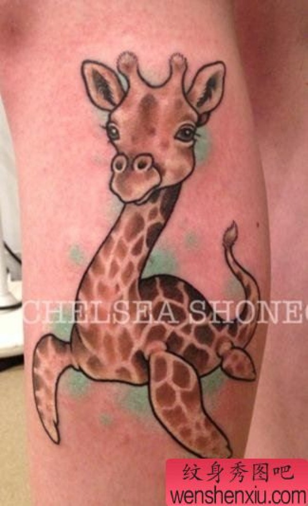 小腿上一张可爱长颈鹿纹身作品欣赏
