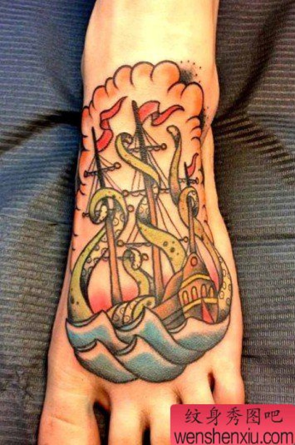 脚背上一张帆船纹身图案欣赏