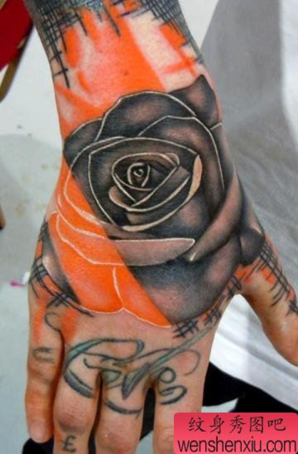 手背上一张漂亮的玫瑰花纹身作品