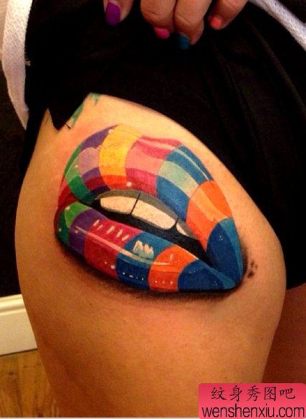 大腿上一张性感唇印纹身作品