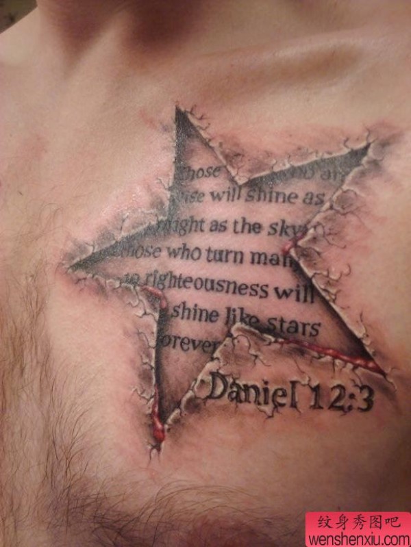胸口烙印五角星英文字母纹身
