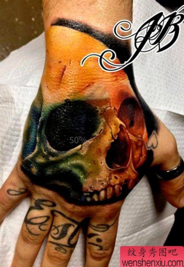 手背上一张时尚彩色骷髅纹身作品