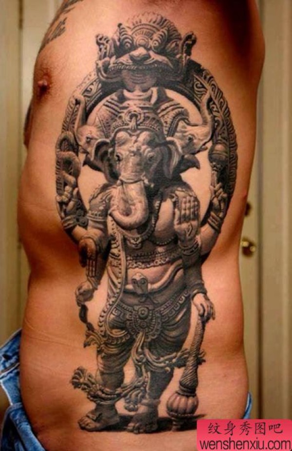 分享一张侧腰石雕象神纹身作品