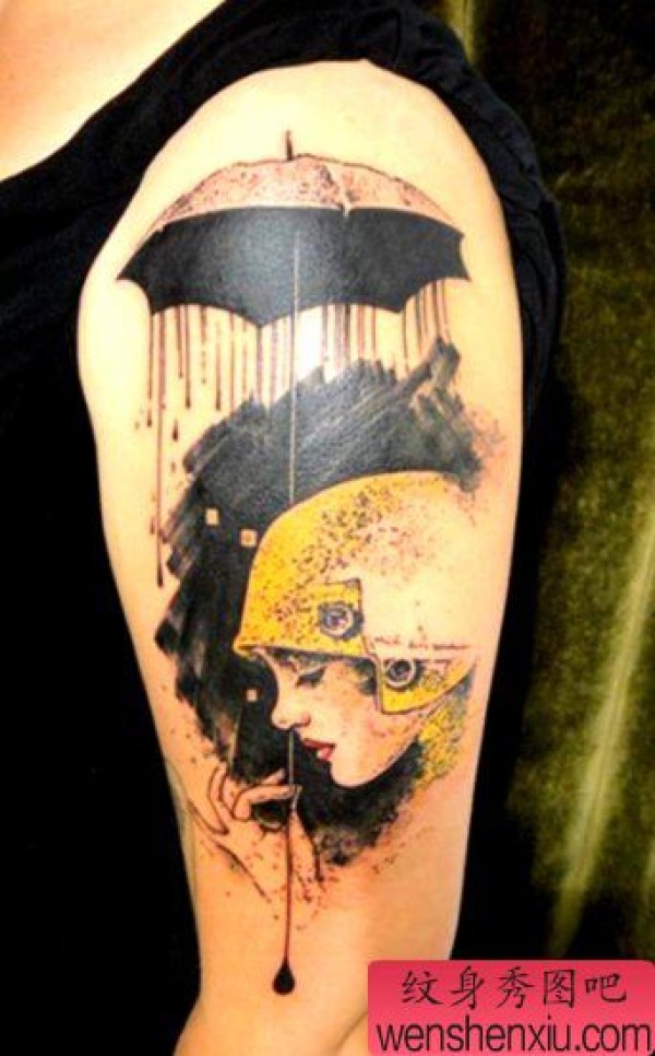 大臂上一张抽象人物纹身作品