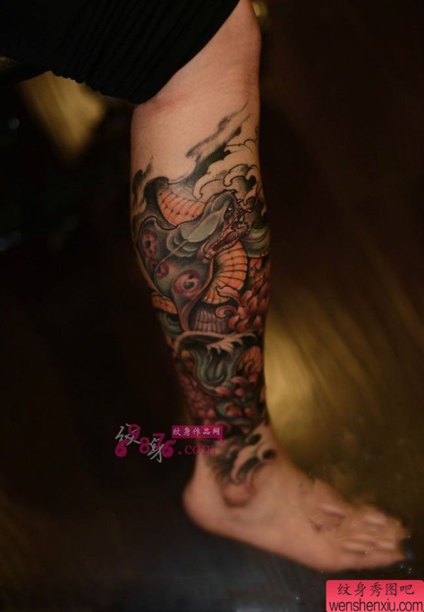 一张很潮很时尚的新传统眼镜王蛇小花腿纹身欣赏