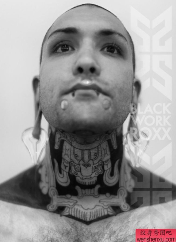 男子很酷的颈部脖子黑灰图腾纹身欣赏