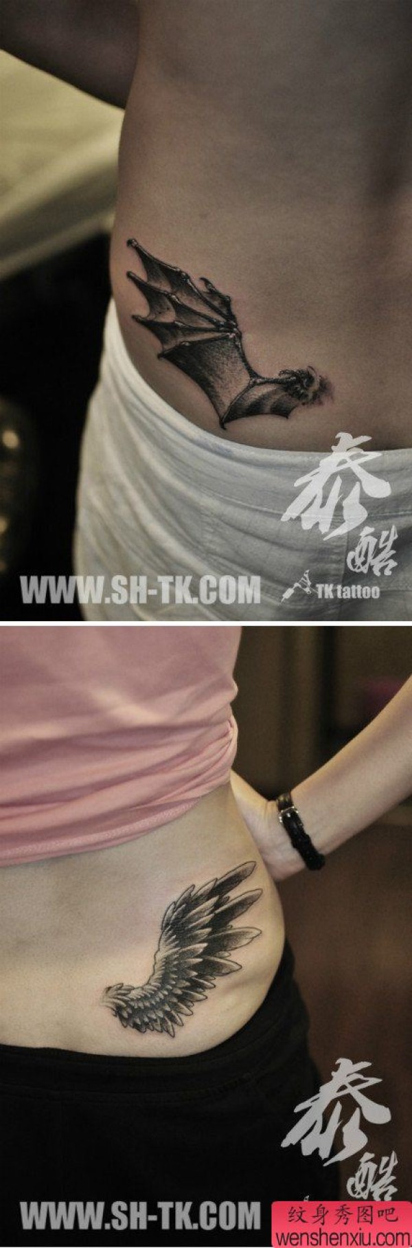 腰部时尚的情侣天使与恶魔翅膀纹身图案