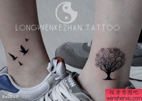 腿部时尚时尚的情侣小树与小鸟纹身图案