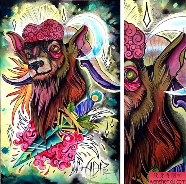 为大家分享一张个性的欧美羊纹身图案
