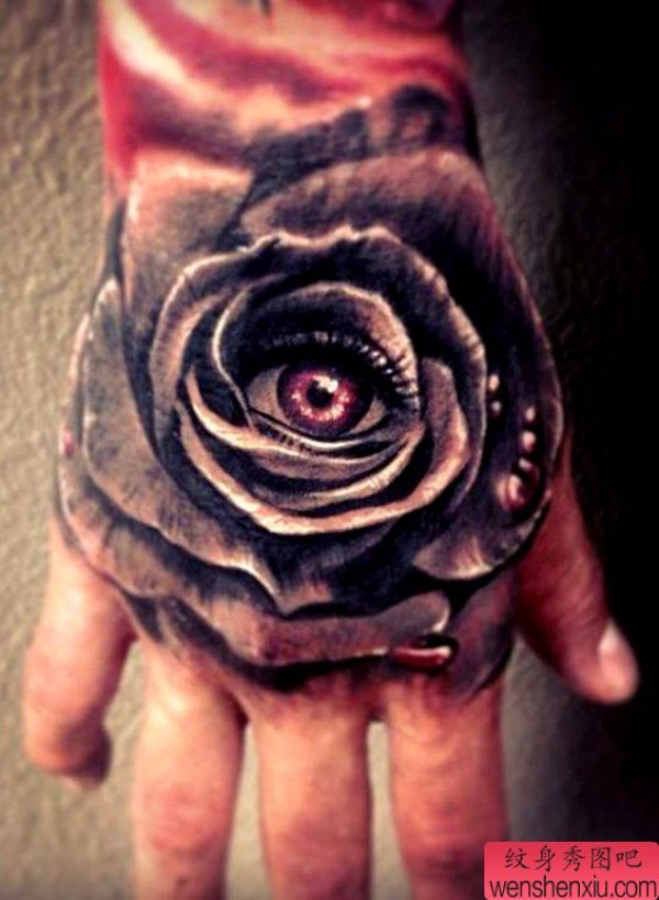 手背上的一张恐怖玫瑰花纹身图案