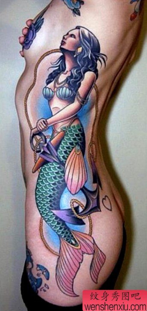 侧腰上一张漂亮性感的美人鱼纹身图案