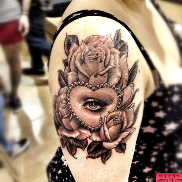 分享一张大臂爱心玫瑰花纹身作品