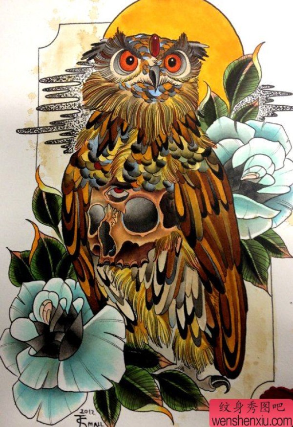 老兵纹身分享一张school风格猫头鹰纹身图案