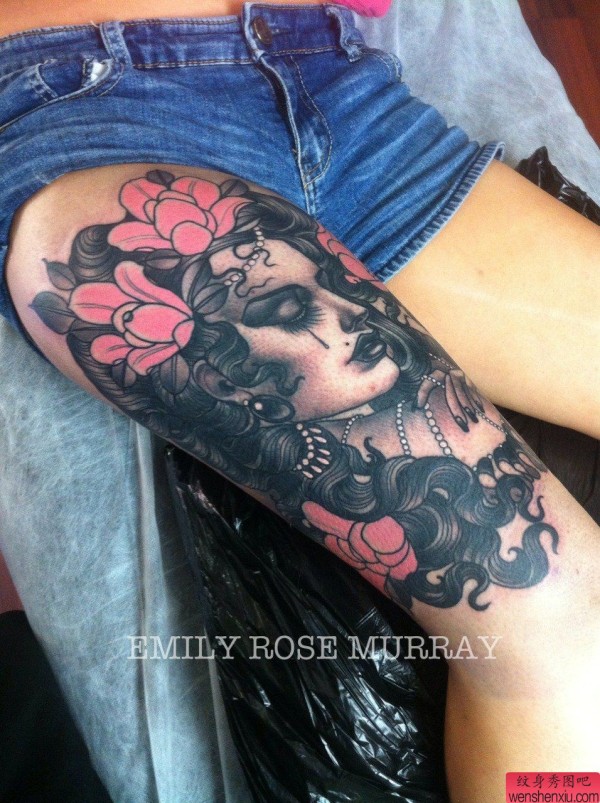大腿上一张时尚欧美人物纹身图案