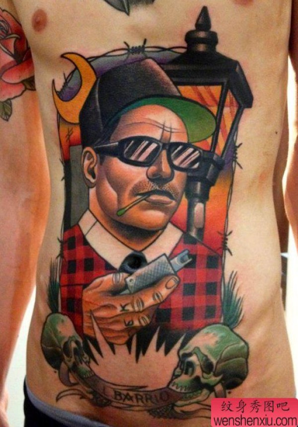 侧腰上一张个性人物肖像纹身图案