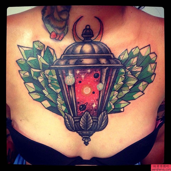 胸部上一张个性的欧美油灯纹身图案
