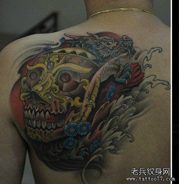 男人背部彩色嘎巴拉霸气龙纹身图案