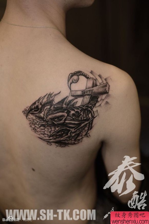男士肩部蝎子十字架纹身图案
