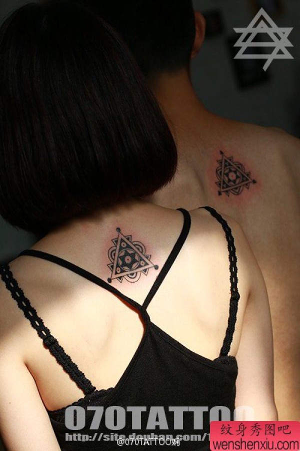 情侣后背上一张个性三角形纹身作品