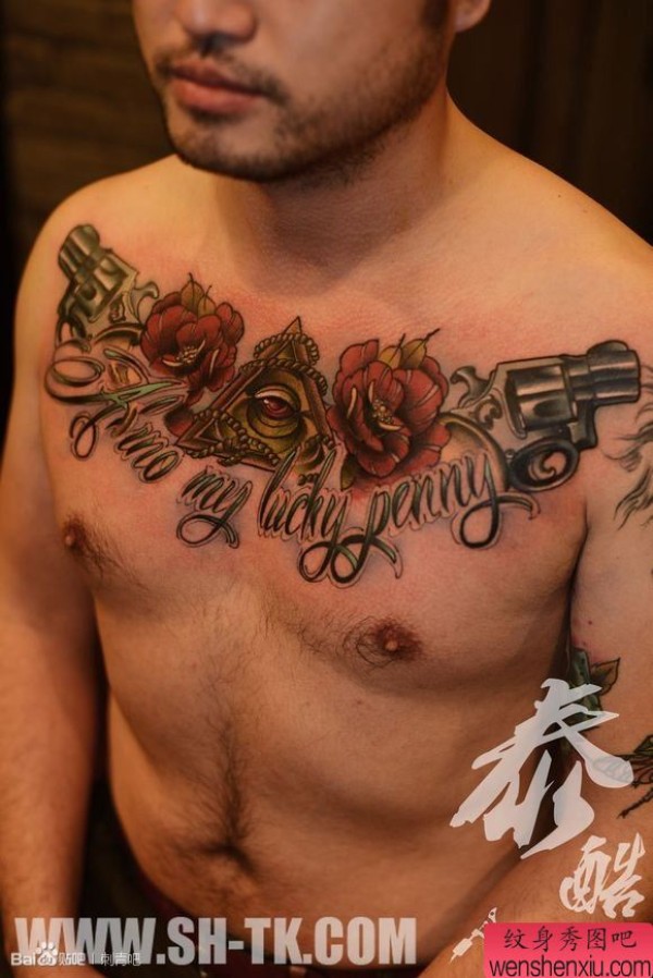 男士胸部手枪玫瑰花上帝之眼纹身图案