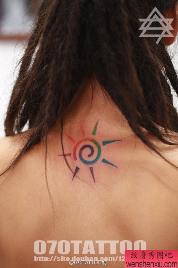 美女后背一张时尚的彩色太阳纹身图案