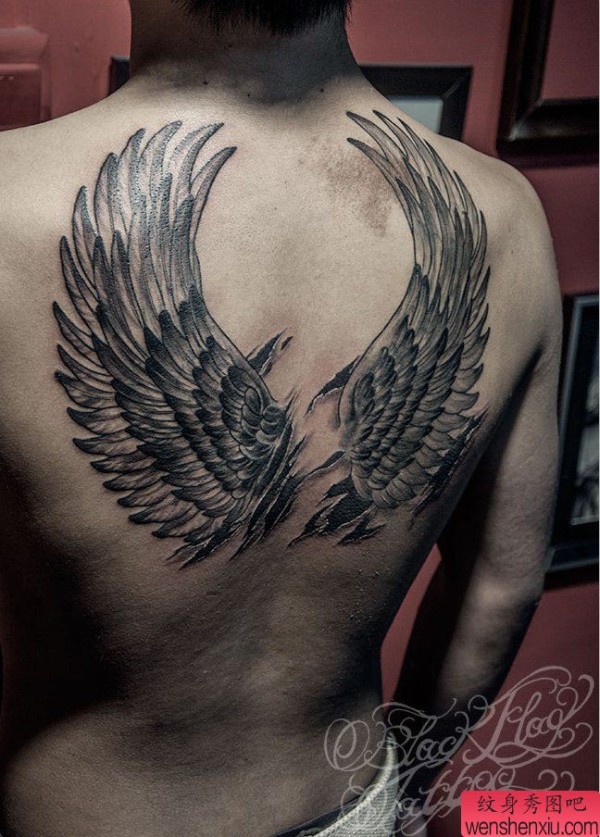 纹身图吧分享一颗背部天使翅膀纹身图案